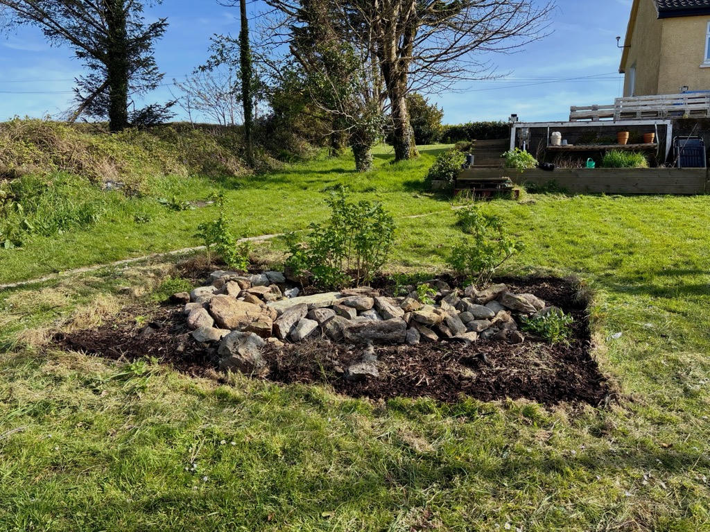 Around the rockery with the roses, I removed the rocks along the edges and we'll just let the robot mower keep the grass cut around it, and even if the grass starts growing around the roses, that's ok too because Rugosa roses have the potential to take over and grow a LOT. At the bottom side there's super tiny Rugosa that you probably don't see in the picture, next to it there's a xxx that grows quite big in the summer, and at the bottom right I need to plant another rose, or something else.