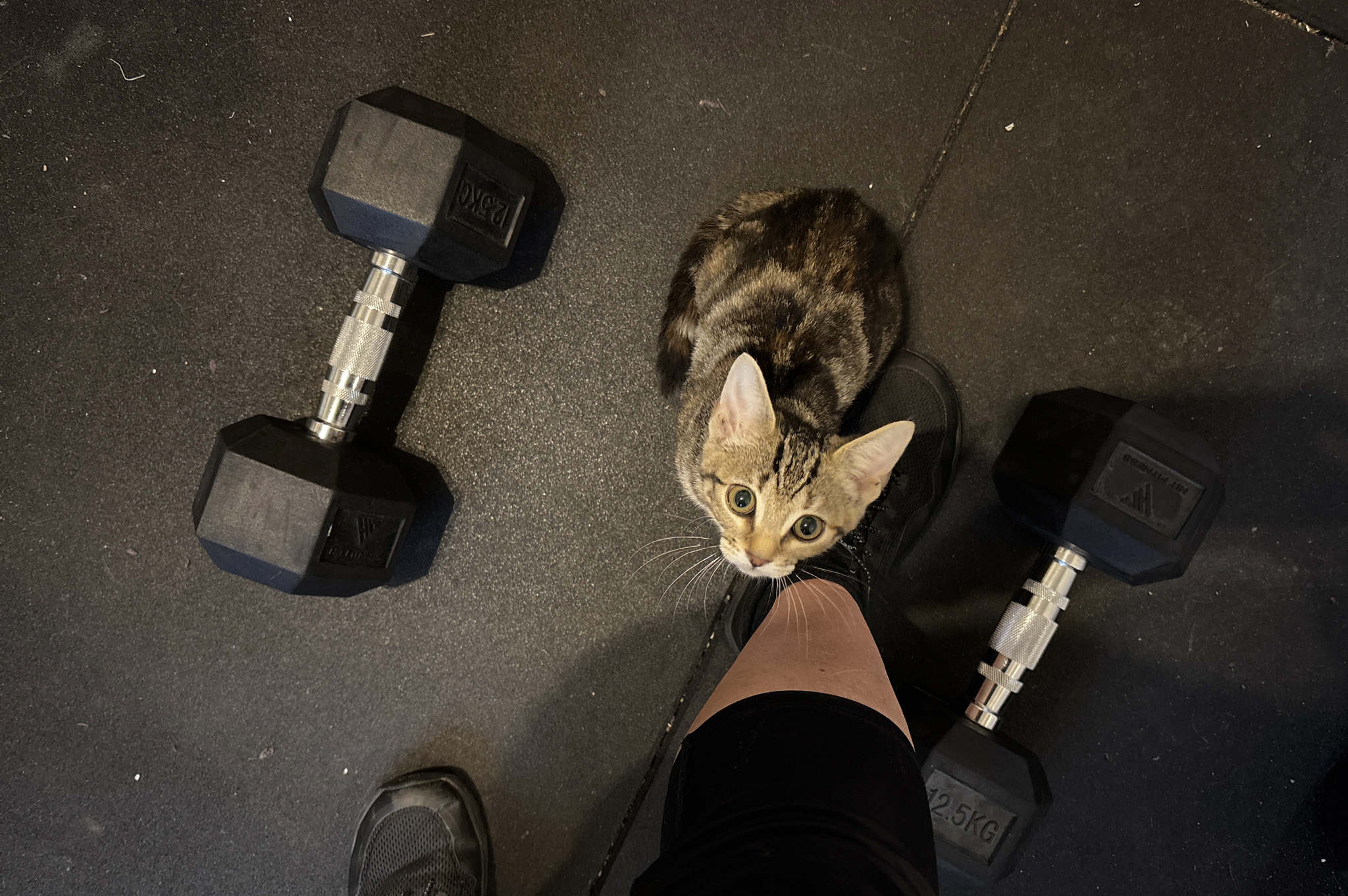 She was wandering around in the gym looking very interested, and I didn't dare to do anything where a fast-moving kitten could suddenly get between the floor and a heavy weight (like with Renegade rows), and I didn't have the patience to fiddle with the bench to do flyes. My program ended up something like this, with 3 x 10 reps: