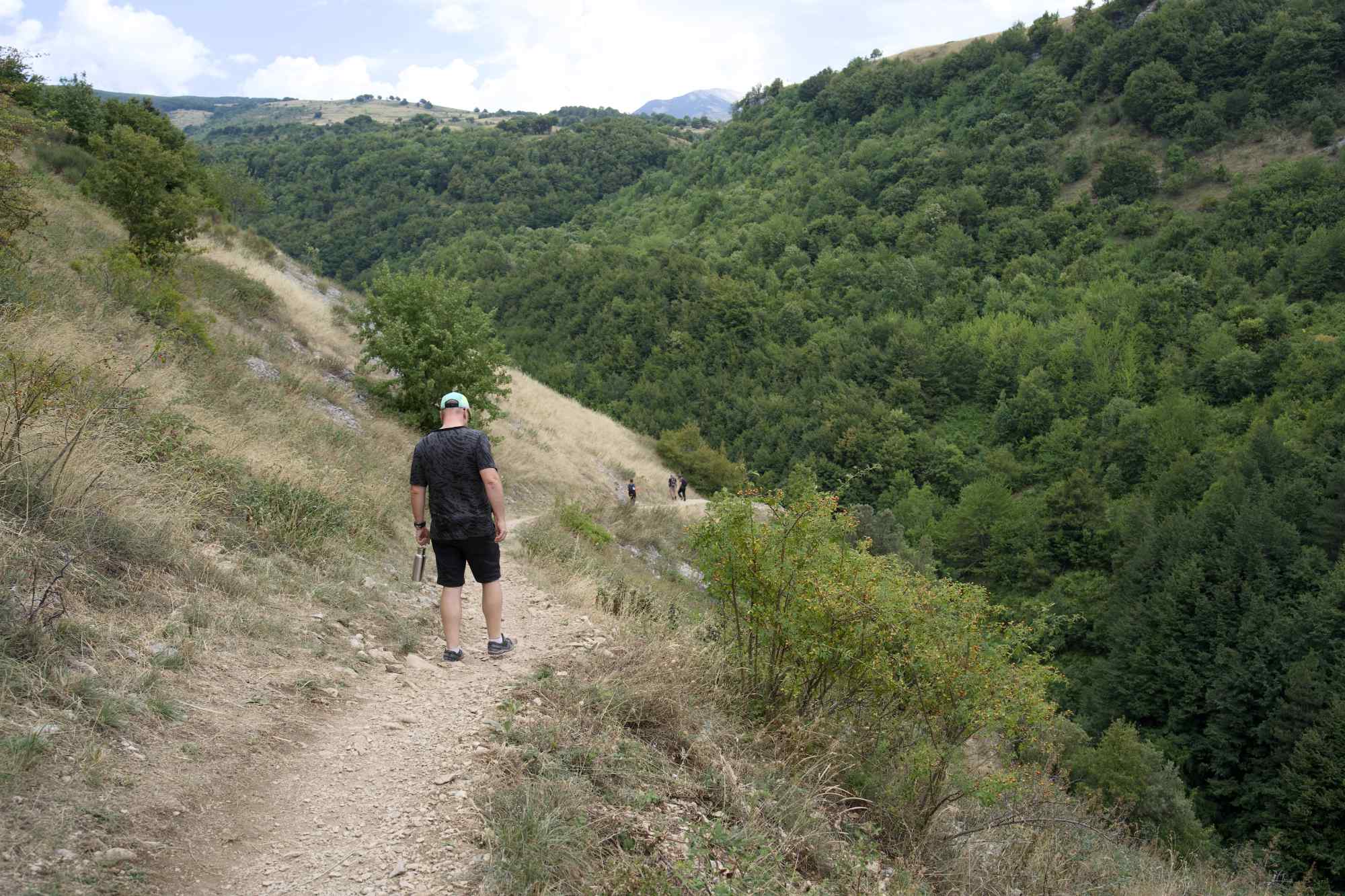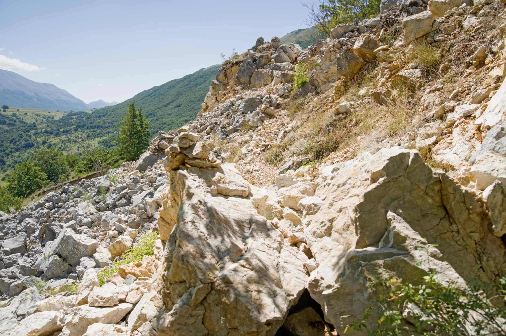 After a while we came to a flatter part where the trail became wider and rockier, and later started going downhill – and continued downhill. We both agreed it would be nice to go a bit further and see if we could see Pacentro. Many times we said to each other “Should we turn back? No, let’s continue another little bit.”